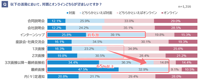 ●説明会・1次面接は約6割がオンラインでの実施を希望。一方インターンシップ・3次面接以降は対面での実施を希望する学生が6割を超える(図表1)