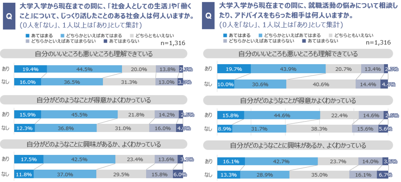 ・社会人と話す機会を持った人、就職活動について他者に相談を行った人ほど、自己理解ができていると認識している。