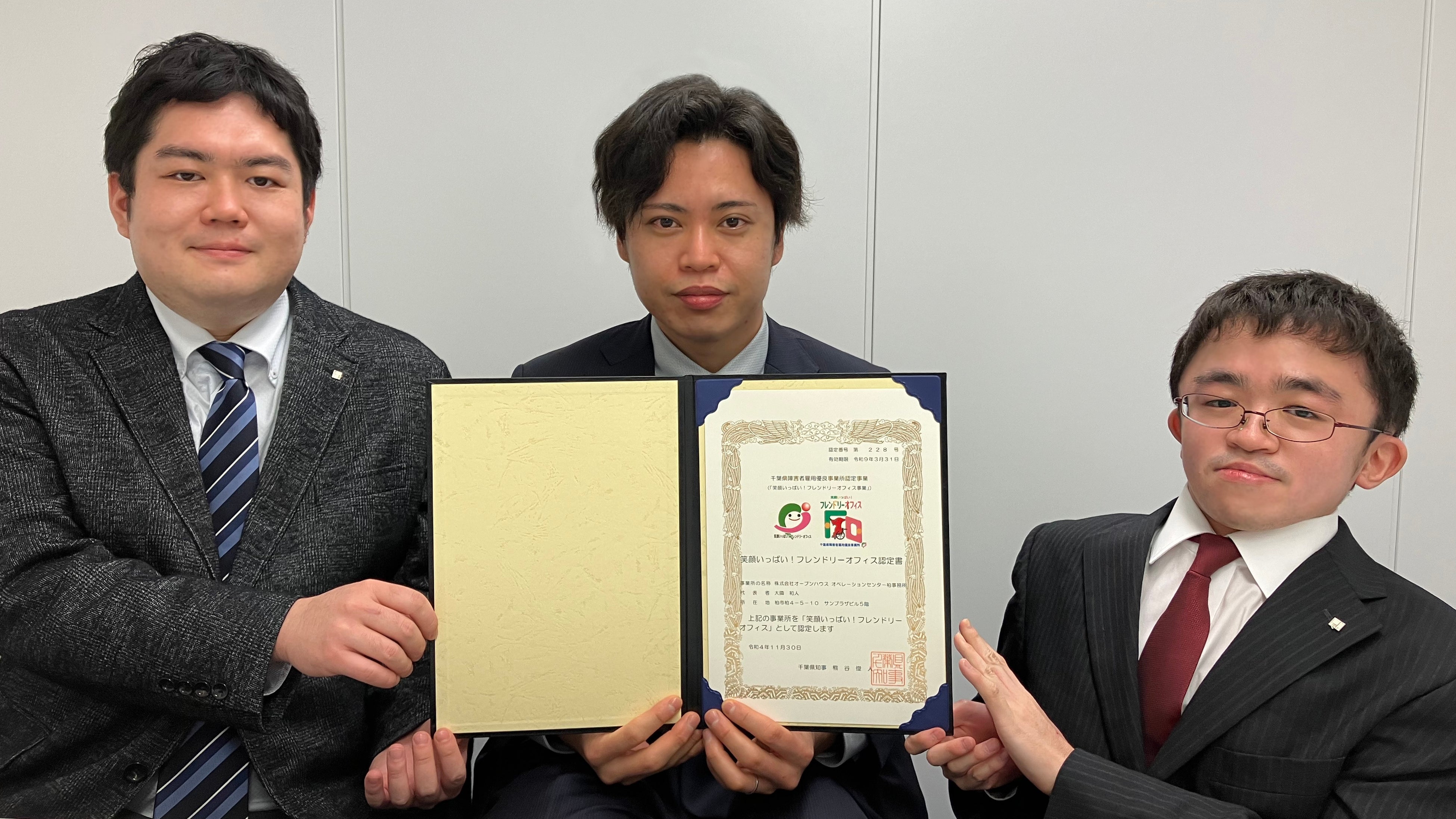 柏オペレーションセンターが、「笑顔いっぱい!フレンドリーオフィス」(千葉県障害者雇用優良事業所)に認定されました。