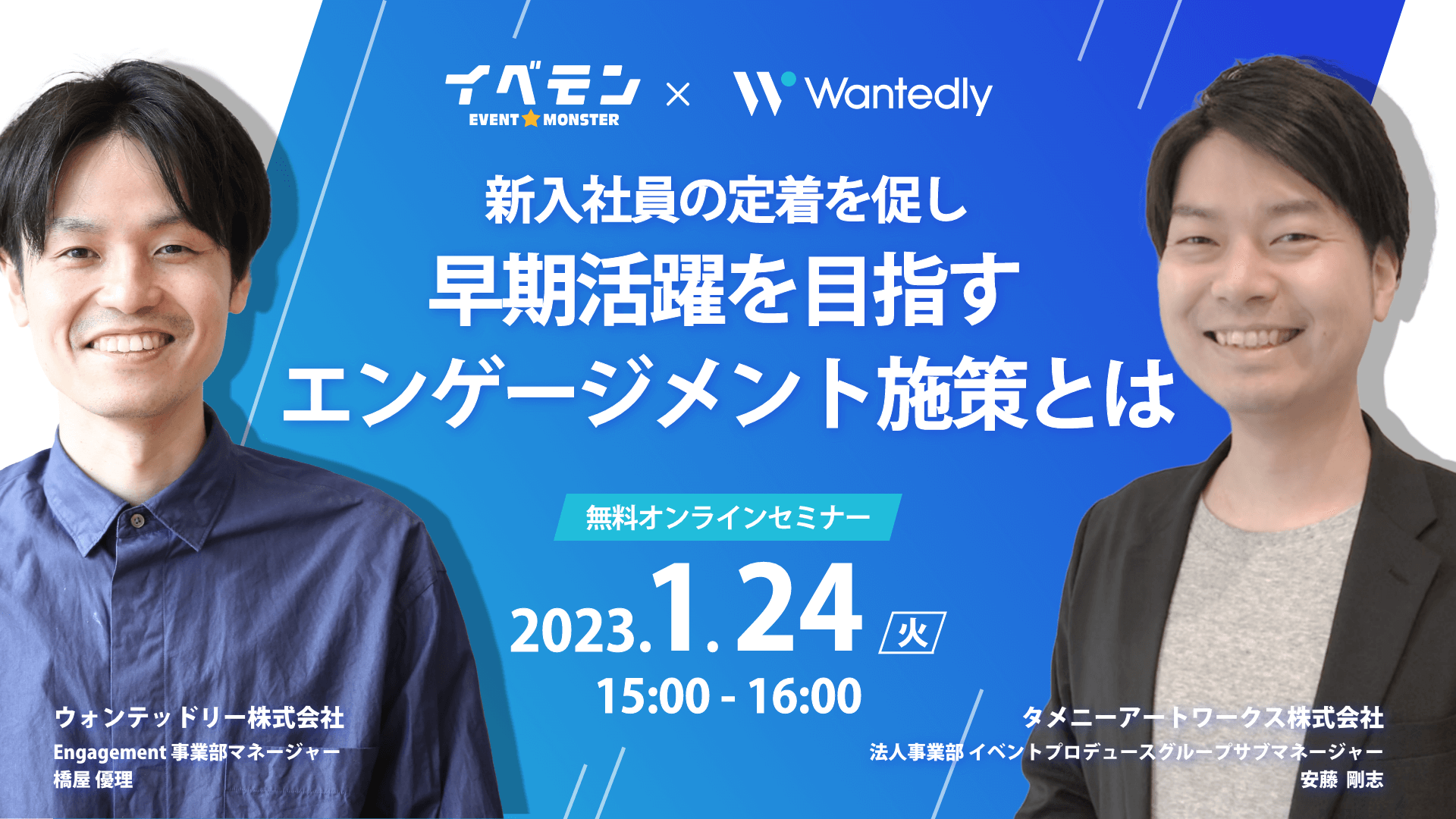 そこでイベモンとウォンテッドリーの共同で『新入社員の定着を促し早期活躍を目指すエンゲージメント施策』をテーマとした無料ウェビナーを開催する運びとなりました。「早期活躍を促せるエンゲージメントが高まる施策とは何なのか?」と悩まれる企業の方々にとって、エンゲージメントを向上させるきっかけ作りにしていただけますと幸いです。