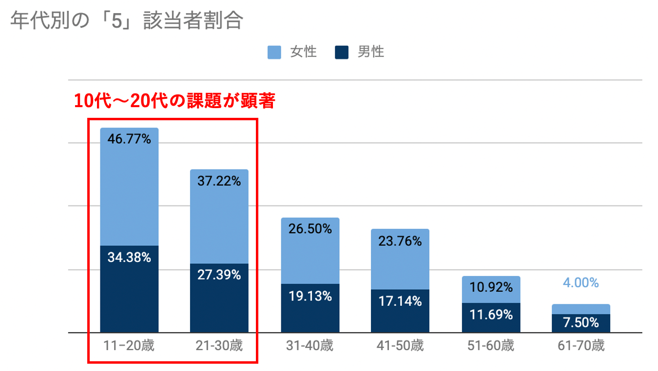 3. 年代が低いほど、最も低評価である「5」の割合が高く、10代〜20代は睡眠に対して課題を抱えている割合が高い