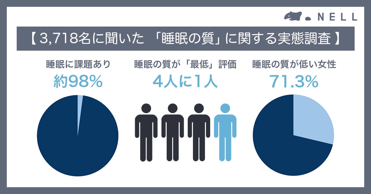 D2C寝具ブランドNELLは、「生活者が睡眠時間以外の生活において最高のパフォーマンスが発揮できるように、質の高い準備=睡眠を提供する」というブランドの目的のために、本イベントにて収集したデータを分析し、現在の日本人の睡眠の質の実態を可視化しました。
