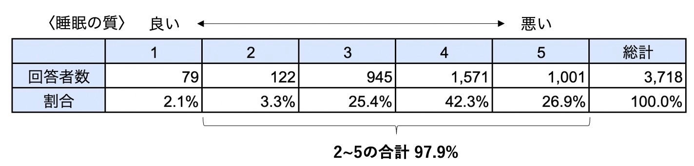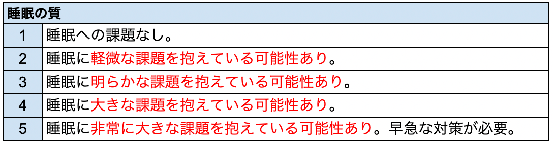 診断結果「1」は睡眠の質に全く問題がない状態であり、「2〜5」は度合いに違いがあれど何らかの課題を抱えている状態といえる。