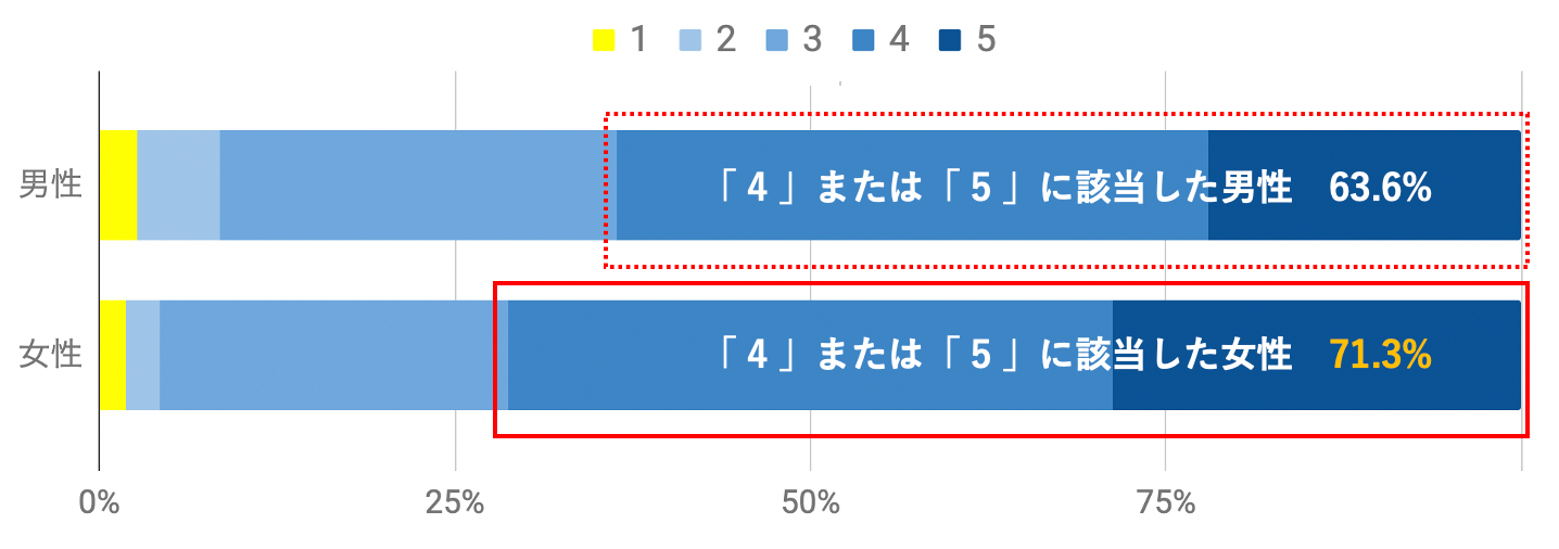 睡眠に大きな課題を抱えている可能性があるといえる「4または5」に該当した割合は男女問わず高いが、特に女性の方が割合が高い(全体の71.3%)結果となった。