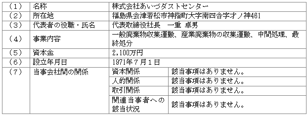 注)あいづダストセンターの株主情報及び最近3年間の財務情報並びに取得価額につきましては、先方の意向を踏まえ記載しておりません。