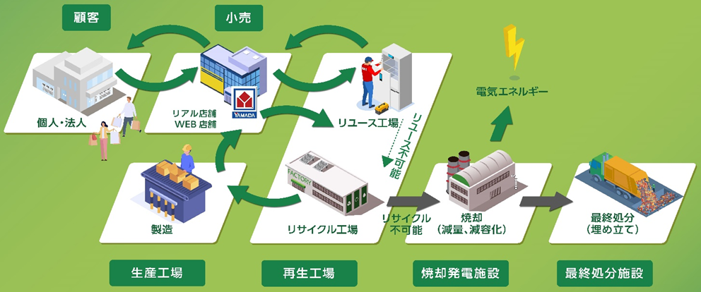 当社は、2021年11月4日に、「YAMADA HD 2025中期経営計画」を公表し、「暮らしまるごと」戦略による各事業(「デンキ」「住建」「金融」「環境」「その他」の5つの事業)のつながる経営をより強固なものにして、事業成長を加速しております。その中でも当社のESG経営の一つである環境事業は、“家電も資源”と捉え、お客様から買い取った家電製品をグループ会社である株式会社シー・アイ・シー、インバースネット株式会社のリユース工場にて動作チェック、修理、クリーニング作業等を行い、リユース品としてヤマダアウトレット店舗で販売しております。また、リサイクル部門は当社グループ各店舗で回収した使用済み小型家電を資源化するため、認定事業者であるグループ会社東金属株式会社にて解体、破砕を行い素材ごとに分別し、再資源化素材の生産を行っております。