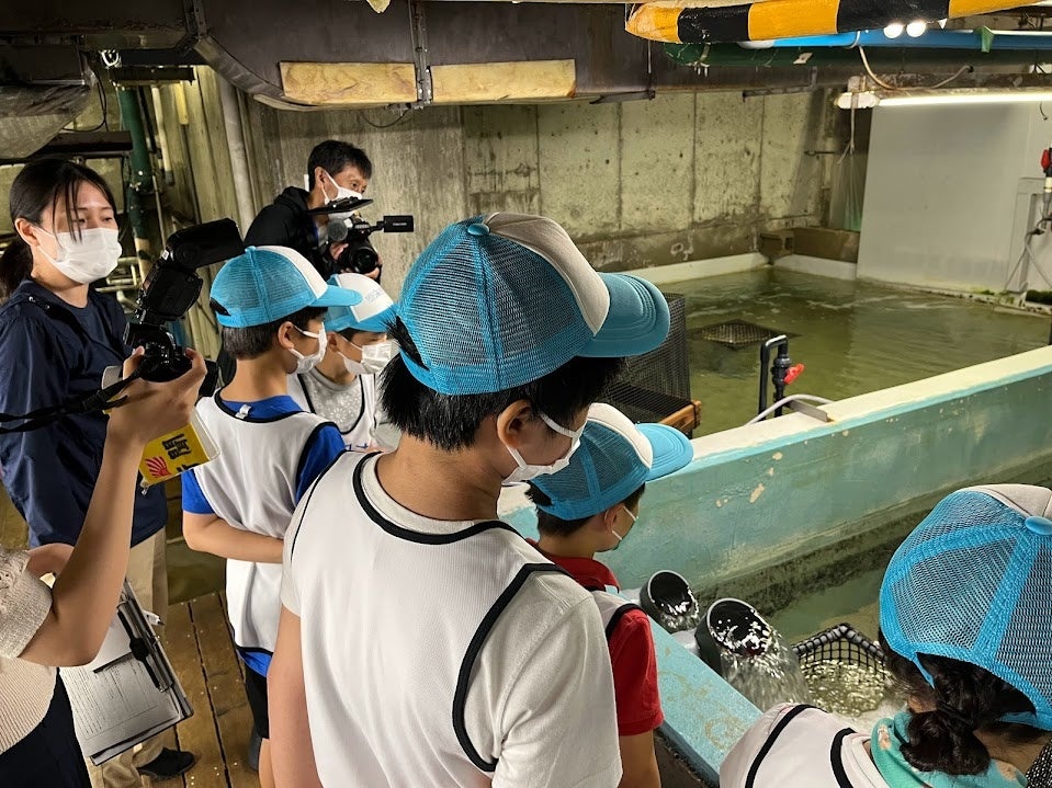 生きものや水族園が大好きな子どもたちにとってバックヤードはとても魅力的な場所。ろ過装置の仕組みやエサづくりの説明を聴いて、少し緊張して静かだった子どもたちのテンションもぐぐっと上がりました。疑問に思ったことは手を挙げて積極的に質問。バックヤードから見た水槽が、お客様側からどのように見えるのかもしっかりと確認しました。