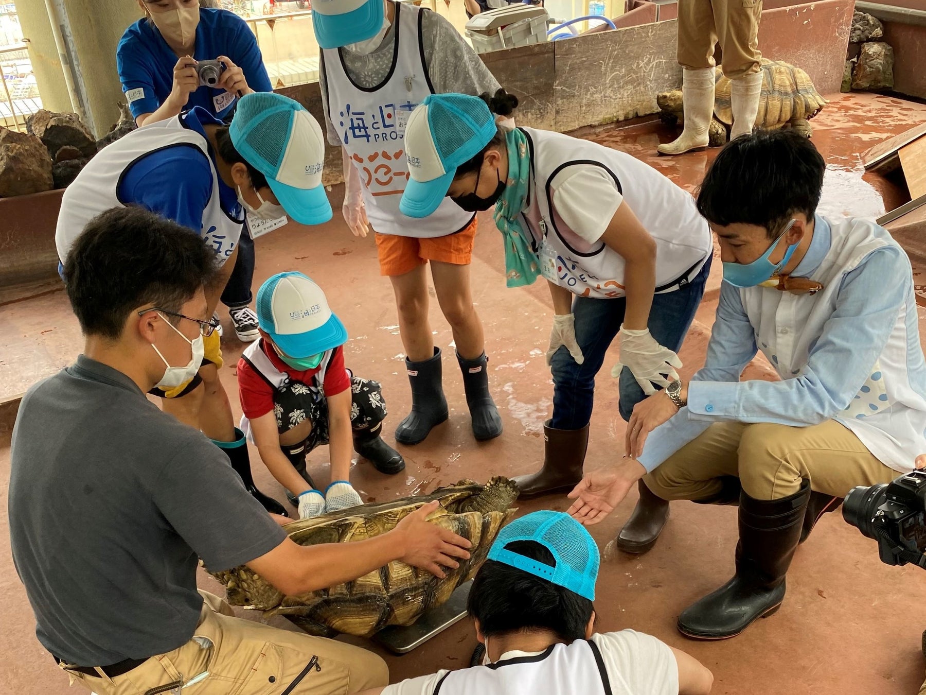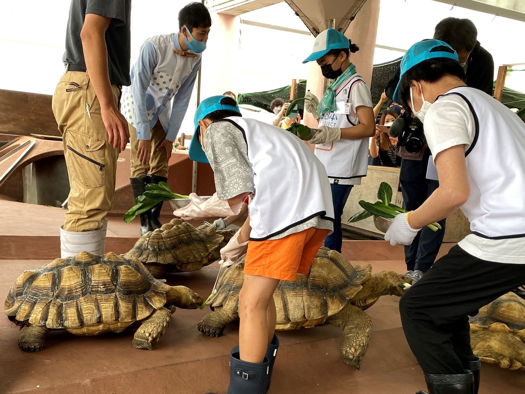 当プログラムは、子どもたちにリクガメとウミガメの担当飼育員として、エサの準備やエサやり、リクガメ舎の掃除などを通して、水族園の役割や生きものの命の大切さを学べる内容で構成されました。