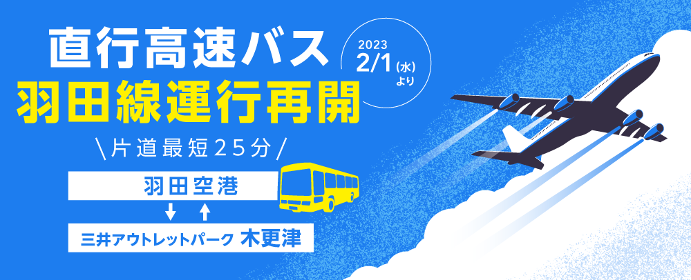 三井不動産商業マネジメント株式会社(東京都中央区)が運営する、三井アウトレットパーク 木更津では、2023年2月1日(水)より直行高速バス羽田空港線の運行を再開いたします。国内外からの空港利用者数の増加を受け、お客様の利便性向上のため、運行を再開いたします。また、運行再開を記念して三井アウトレットパークお買物・お食事券がもらえる期間限定キャンペーンも開催いたしますので、羽田空港をご利用の際はぜひ三井アウトレットパーク 木更津へお立ち寄りください。