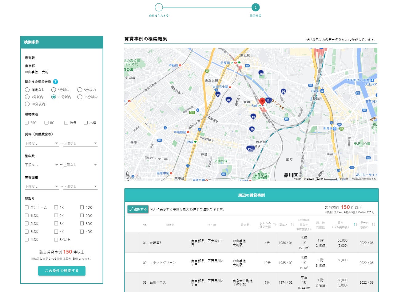 最寄り駅や建物構造等の条件を設定することで、条件に合った賃貸事例と販売事例を検索することができます。