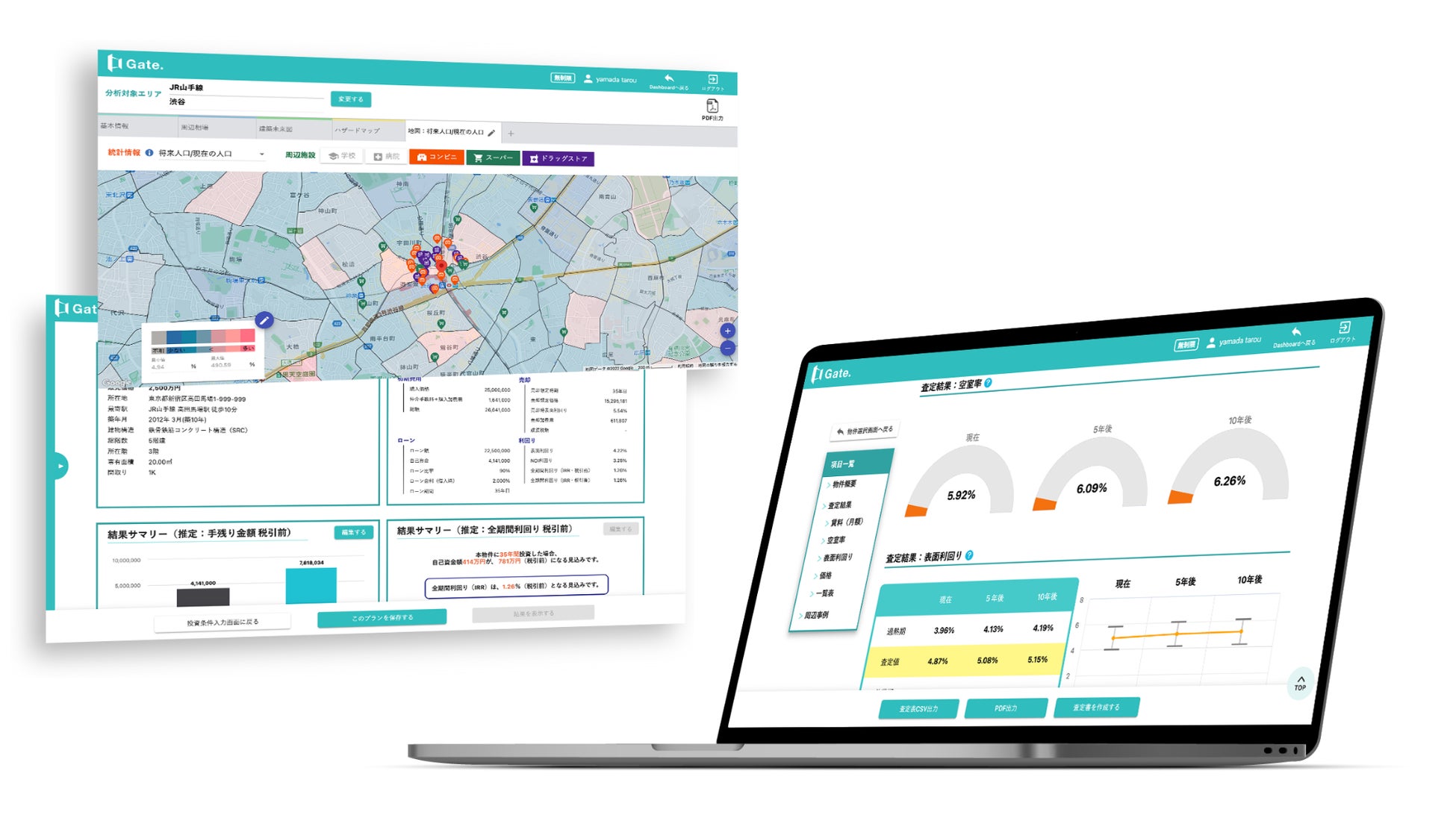 不動産価値分析AIクラウドサービス「Gate.」は12年間独自に収集した2億3,000万件を超える物件データ(2022年11月時点)を元に、人工知能を活用した不動産の査定・投資分析シミュレーションや市場分析・ハザード情報の提供を行っています。