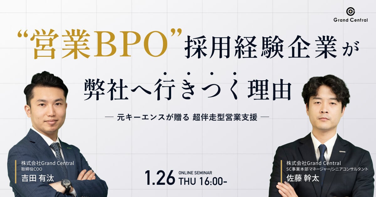 本セミナーでは、営業BPOの業界全体概要から失敗事例、”なぜ企業はGrandCentralを選ぶのか”など、ここでしかお伝え出来ない現場のリアルな声をお届けいたします。