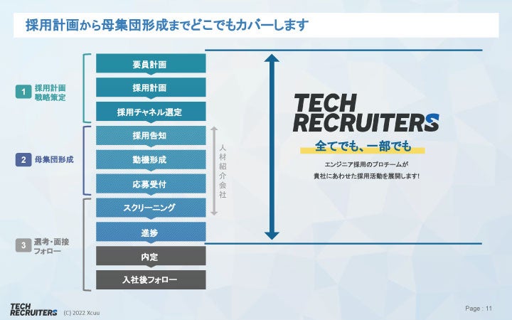 - 採用フローの一部でも、全部でも クライアントごとの採用状況に合わせて提供サービスをカスタマイズすることができます。