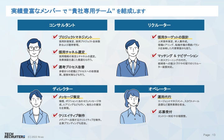 そのため、内定に近い選考ではスキルだけではなく、人物像やカルチャーマッチング等をクライアントに当事者として見ていただきたいという思いから、同じ志を持つ人材のプロフェッショナル達と共に本サービスを立ち上げました。