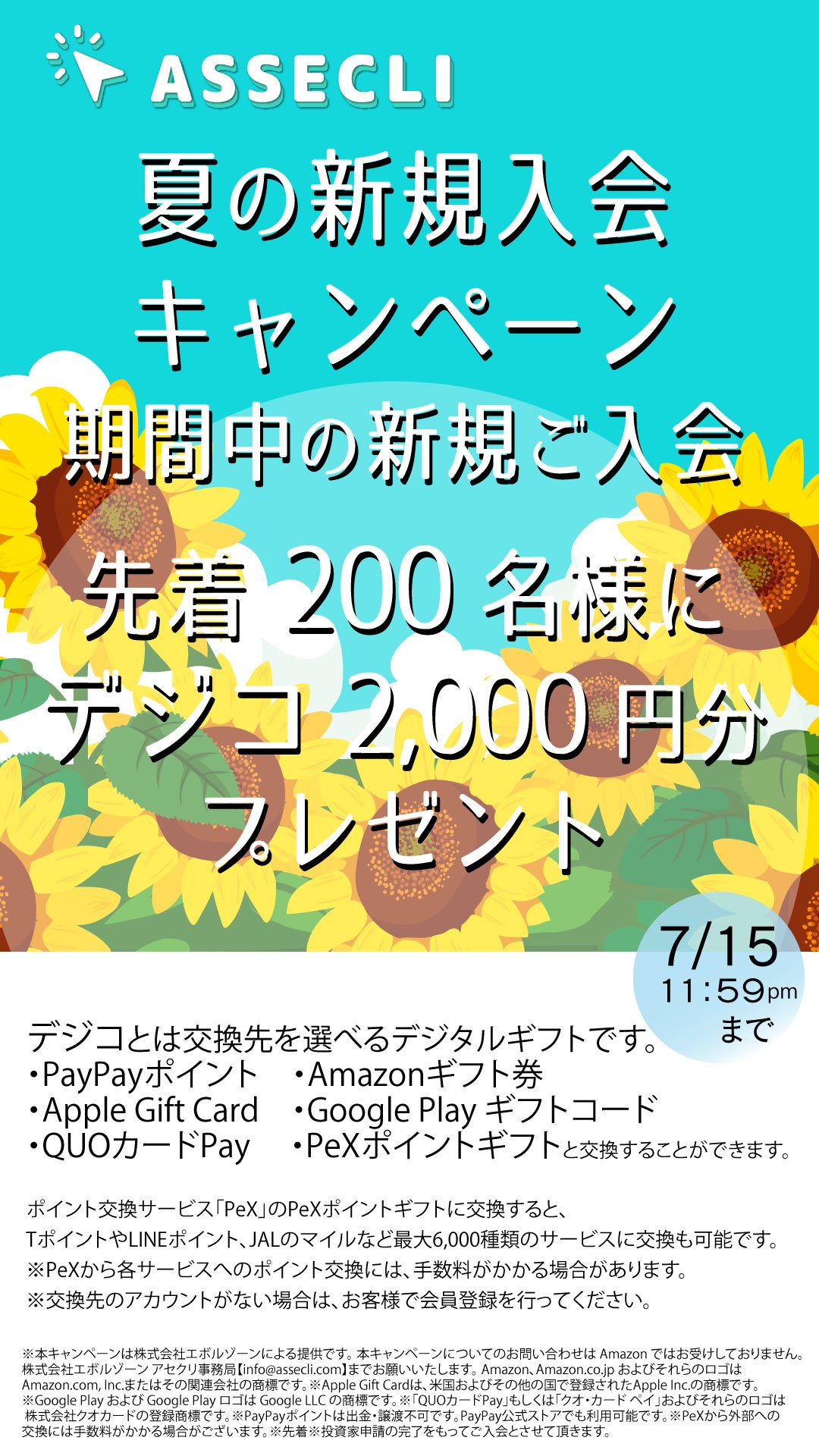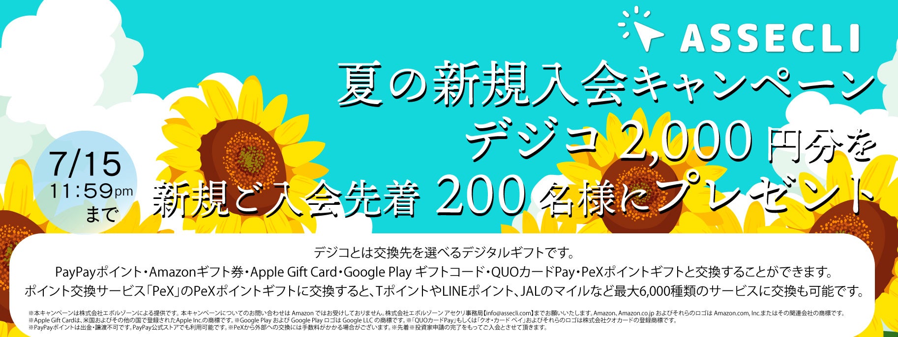 本日6月24日0時から7月15日23時59分までの期間中に新規で投資家登録をされた方、先着200名様にデジコ※2000円分をもれなくプレゼントさせて頂きます。