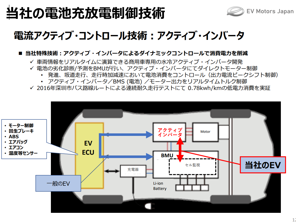 車両には独自技術開発である「アクティブ・インバータ」を搭載しており、BMSとモーターを最適に制御することで、バッテリーの劣化防止と電力消費の大幅な削減に成功し、バッテリーの長寿命化と長距離の走行を実現いたしました。