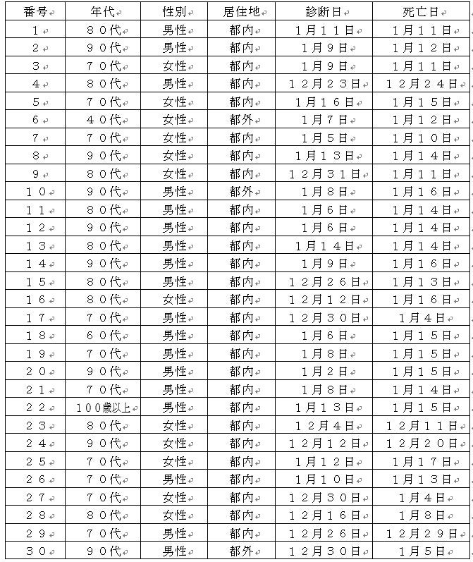 新型コロナウイルスに関連した患者の死亡について business Twitter Facebook はてブ Pocket LINE コピー 2023.01.18 この記事は約1分で読めます。 都内で新型コロナウイルスに感染した方が死亡されましたのでお知らせします。 お亡くなりになった方のご冥福をお祈り申し上げます。 1 新型コロナウイルスに関連した死亡者(本日公表分) 2 新型コロナウイルスに関連した死亡者の累計 7,303人