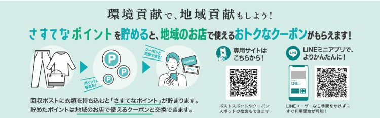 実証事業の実施期間中に、協賛店舗に回収対象の衣類を衣類回収スポットにお持ち込みいただいた方に対し、佐賀市内の店舗等で使えるクーポンと交換できる「さすてなポイント」(グリーンライフ・ポイント)を付与します。