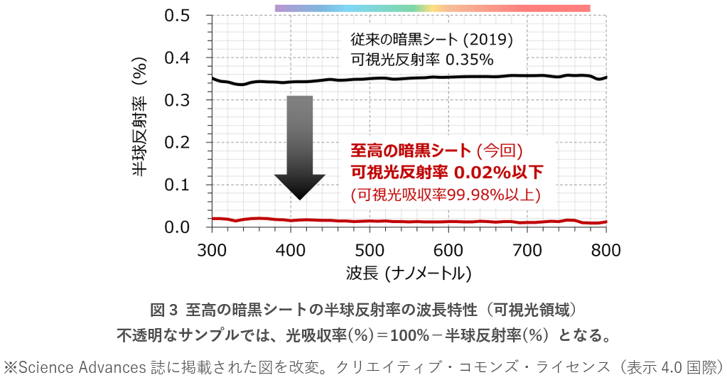 今回、シリコーン樹脂製の型を介することで(図1右③~④)、光閉じ込め構造の転写対象を拡大する技術(図1右⑤~⑥)も開発したので、カシューオイル黒色樹脂に適用した結果、鏡面反射(ぎらつき)も散乱反射(くすみ)も抑えられ、従来の暗黒シートと比較して可視光の反射率が一桁以上低い0.02%以下(光吸収率99.98%以上、図3)を実現しました。この「至高の暗黒シート」の深い黒はレーザーポインターの光が消えて見えるほどであり(動画1)、触れる素材で世界一の黒さを達成しました(動画2)。