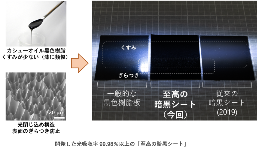 国立研究開発法人 産業技術総合研究所(以下「産総研」という)物理計測標準研究部門 応用光計測研究グループ 雨宮 邦招 研究グループ長、清水 雄平 主任研究員、光放射標準研究グループ 蔀 洋司 研究グループ長と、国立研究開発法人 量子科学技術研究開発機構(以下「量研」という)量子ビーム科学部門 越川 博 主幹技術員、八巻 徹也 研究企画部長は、漆類似成分のカシューオイル黒色樹脂の表面に微細な凹凸を形成して光を閉じ込めることで、可視光の99.98%以上を吸収する「至高の暗黒シート」を開発しました。