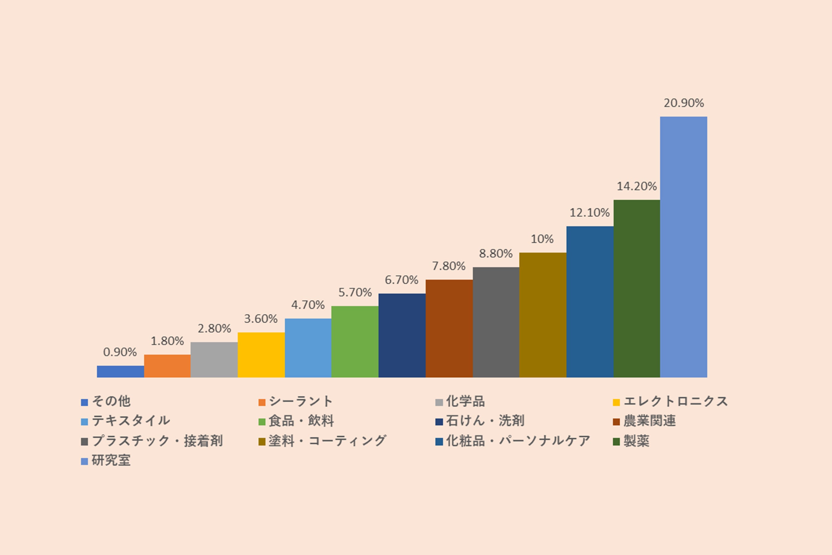 エンドユーザーに関しては、市場は研究所、プラスチックと接着剤、シーラント、繊維、医薬品、食品と飲料、化学薬品、化粧品とパーソナルケア、農業、塗料とコーティング、石鹸と洗剤、電子機器などに分割されています。 これらの研究所の中で、2022年に最高のセグメントシェアを保持しました。