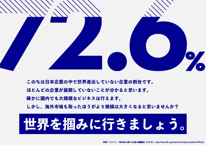 現在日本企業の72.6%が海外進出をしていないと言われています。その理由の一つとして、情報として流れていないその国の文化やブーム、ノリなどを捉えることが難しいということがあると考えます。