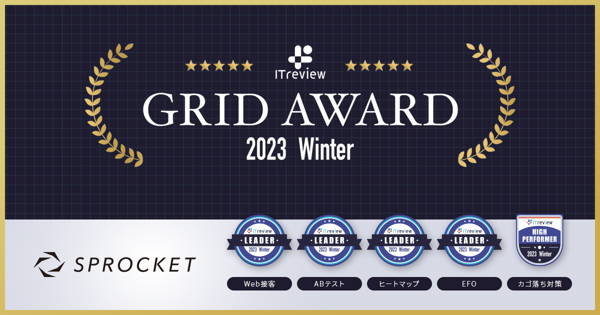 今回の受賞でSprocketは、評価対象となった4部門で特にユーザー満足度において高い評価を得ており、ABテスト、ヒートマップ部門では6期連続、Web接客においては5期連続のLeader受賞となりました。「機能面ではシナリオ分岐があるため、より丁寧なご案内ができる」「コンサルティングの方の企画提案から設計・公開・検証・再提案までお任せしているので、接客ツールを自社サイトに取り込むことができた」「ポップアップの効果を判定する上でABテストなどを実施し、検証することが大事だと思いますが、管理画面上でのABテスト結果もシンプルで分かりやすい」などの評価をいただいております。