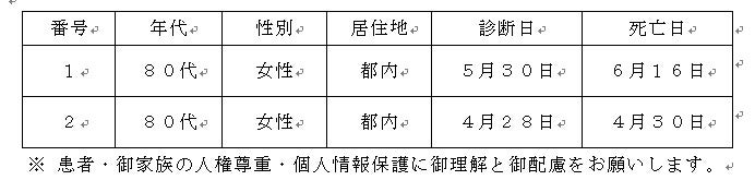 新型コロナウイルスに関連した患者の死亡について business Twitter Facebook はてブ Pocket LINE コピー 2022.06.24 この記事は約1分で読めます。 都内で新型コロナウイルスに感染した方が死亡されましたのでお知らせします。 お亡くなりになった方のご冥福をお祈り申し上げます。