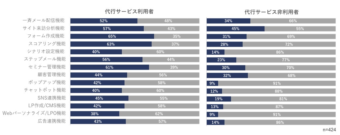 - MAツール運用代行サービス利用している企業ほど、各機能を活用できている割合が高い