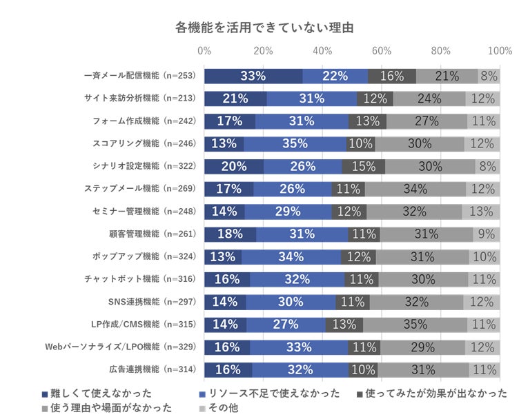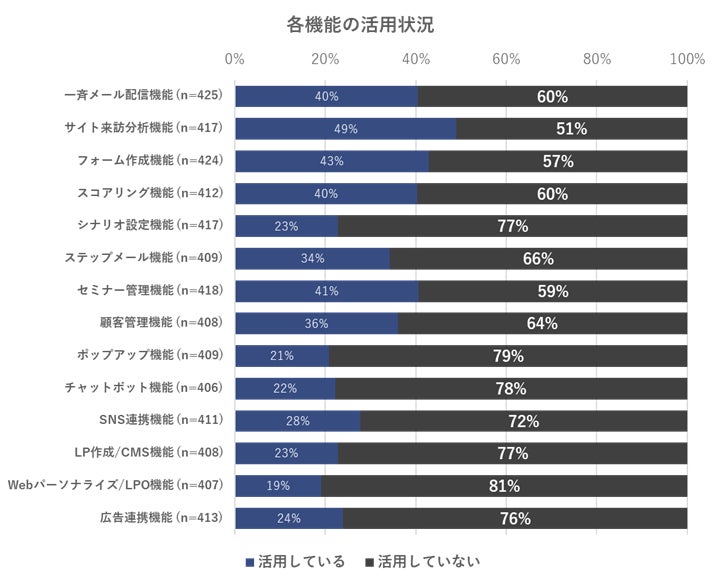 MAツールの各機能について、ツールに機能が搭載されているにも関わらず、51%以上が「活用していない」と回答しました。
