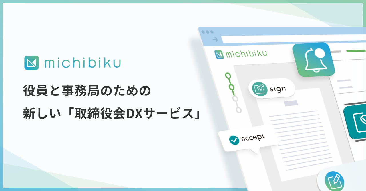 2021年9月より、取締役会等の重要会議運営管理プラットフォーム『michibiku』を提供。取締役会管理のDX化による会議情報の一元管理・業務の効率化で、より実効的な議論の機会を創出。取締役会の本質的な機能発揮を実現します。企業の重要機関における最適な場づくりをサポートし、日本企業の成長促進を支援します。