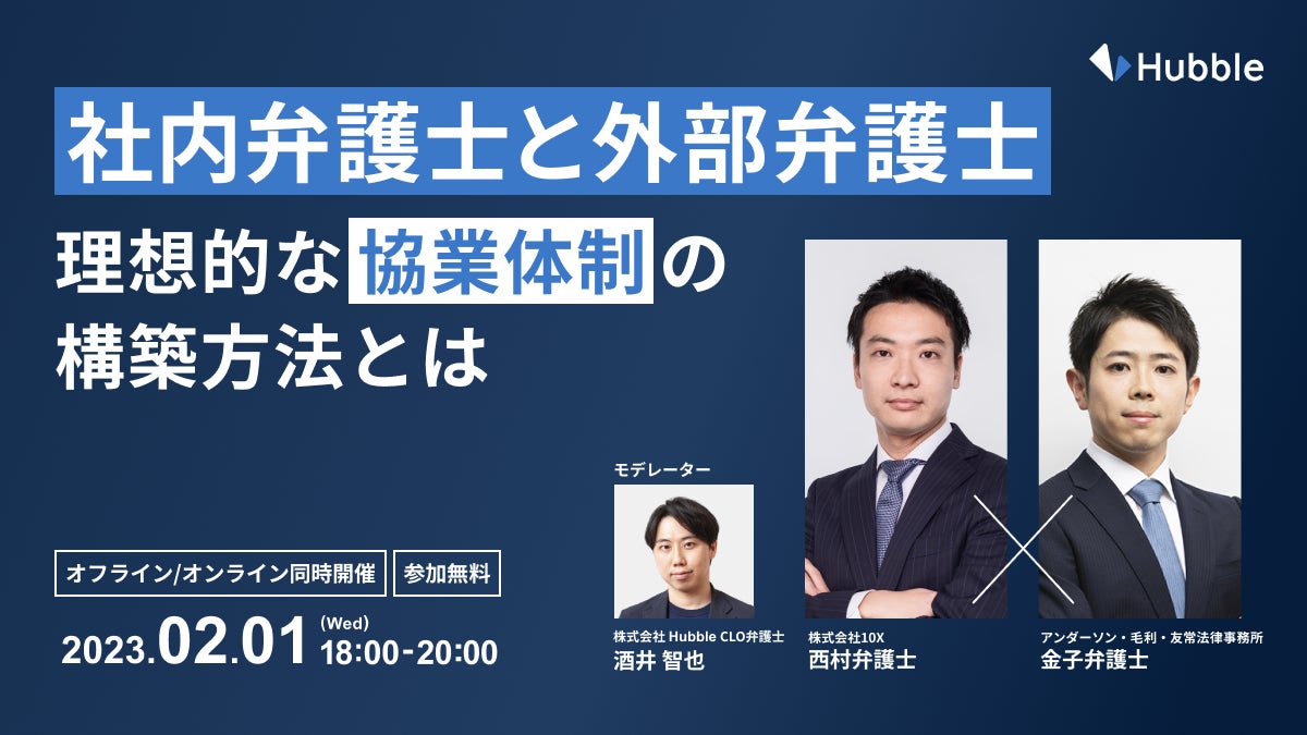 本ウェビナーでは、そんな皆様の課題にお応えすべく、10Xの西村弁護士とアンダーソン・毛利・友常法律事務所の金子弁護士をお招きし、お二人の考える理想的な役割分担や双方が互いに「本音」で求める対応を、弊社取締役CLOの酒井がモデレーターとなり、ディスカッション形式でお届けいたします。