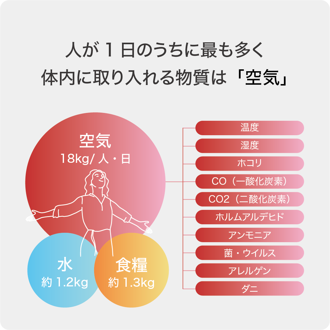 「室内空気質 (IAQ:Indoor Air Quality)」とは空調・環境関連の業界で使われる用語で、温度、湿度、二酸化炭素、清浄度など、人を取り巻く空気の質を健康や快適さの視点から評価する指標です。内装や建材の影響により、室内の汚染物質濃度は一般的に屋外の2〜5倍高いとされています。加えて「空気」は1日のうちに人が最も多く体に取り入れる物質(空気:18kg/人、水:1.2kg/人、食料:1.3kg/人)で、人が生涯で摂取するものの83%は空気とされており、健康に影響を与える因子を多く含んでいることから、これまでもさまざまな調査等で病気や死亡率の高さとの相関が示されています。