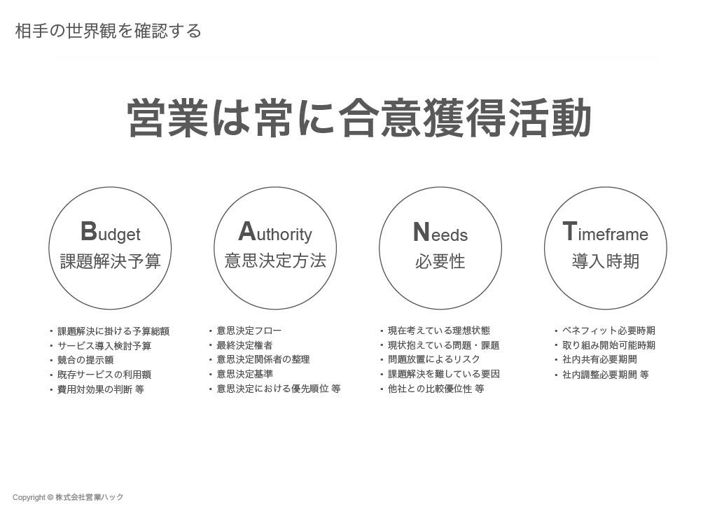 営業=合意獲得活動と言い換えられます。ヒアリングで有名な「BANT情報」ですが、これらもただ聞くのではなく会話の中ですり合わせをして、それぞれ合意を得て作っていくものです。合意を得ることにより、コミュニケーションエラーを防ぎながら、期待値や利益面の調整をすることが可能です。
