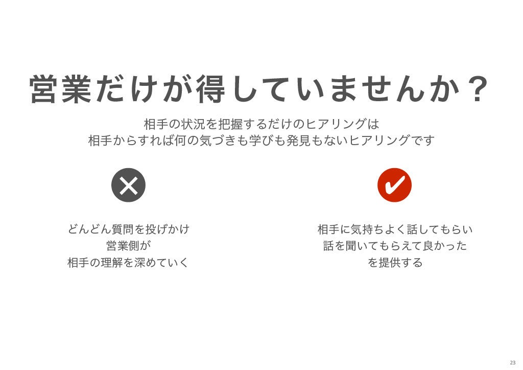 ヒアリングは重要。これが営業の共通認識です。ただ、「ヒアリングされたい」というお客様は多くありません。これは営業がただ結果を質問するヒアリングになってしまっているのが原因です。相手に気持ちよく話してもらい、気づきや学びを提供するコミュニケーションを意識することが重要になります。