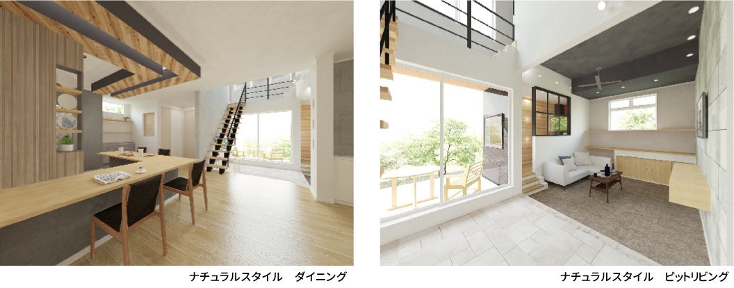 温かみのある木の質感を取り入れたナチュラルスタイルは、リビングとダイニングキッチンの境目に段差を設けた空間使いが特徴です。ダウンフロアとなっている10帖のピットリビングは家族だけの“くつろぎ空間”として、テラスに繋がる4.5帖のアウトドアリビングと造作カウンターを設けた15.5帖ダイニングキッチンは、ホームパーティーなども愉しめる“おもてなし空間”としてご提案いたします。さらに使い勝手のよいワークスペースや水回りから繋がるランドリースペースなど、あったらいいなの空間をご覧いただけます。
