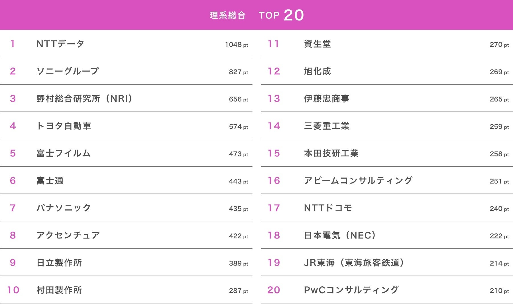 前述の3社ほか、5位に富士フイルム、9位に日立製作所、 10位に村田製作所がランクインするなどDXという新潮流で活躍を見せる企業が目立つ。そんな企業をサポートするコンサルは、業界を問わず多様なスキルを蓄積できることもあってか、3位に野村総合研究所(NRI)、8位にアクセンチュアがランクイン。また、4位はトヨタ自動車、7位はパナソニックと、昨年に引き続きメーカーの人気も堅調だ。