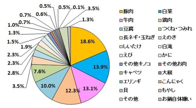 比率が1割を超えているのは「豚肉」(18.6%)、「白菜」(13.9%)、「牛肉」(13.1%)、「鶏肉」(12.3%)、「豆腐」(10.0%)で、5つ合わせると6割近くになります。