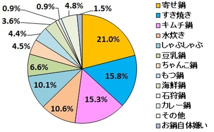 好きな鍋のトップ3は「寄せ鍋」(21.0%)、「すき焼き」(15.8%)、「キムチ鍋」(15.3%)。