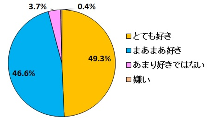 「お鍋は好きですか?」の質問に対し、「とても好き」という回答は49.3%、「まあまあ好き」が46.6%、合わせると95.9%が「好き」と答えています。