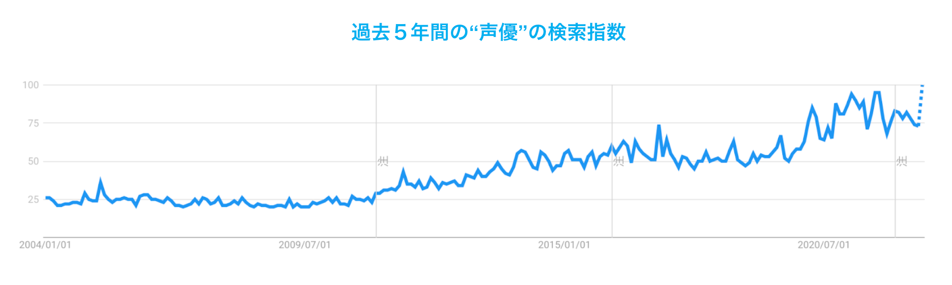 GoogleTrendでも年々検索数が増えており、一般の方における声優の市民権・認知度・人気は伸び続けています。