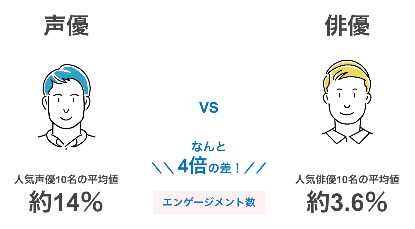 また、人気声優ランキング上位の方と人気俳優ランキング上位の方で比較しても“エンゲージメント率”が圧倒的に高くなっております。