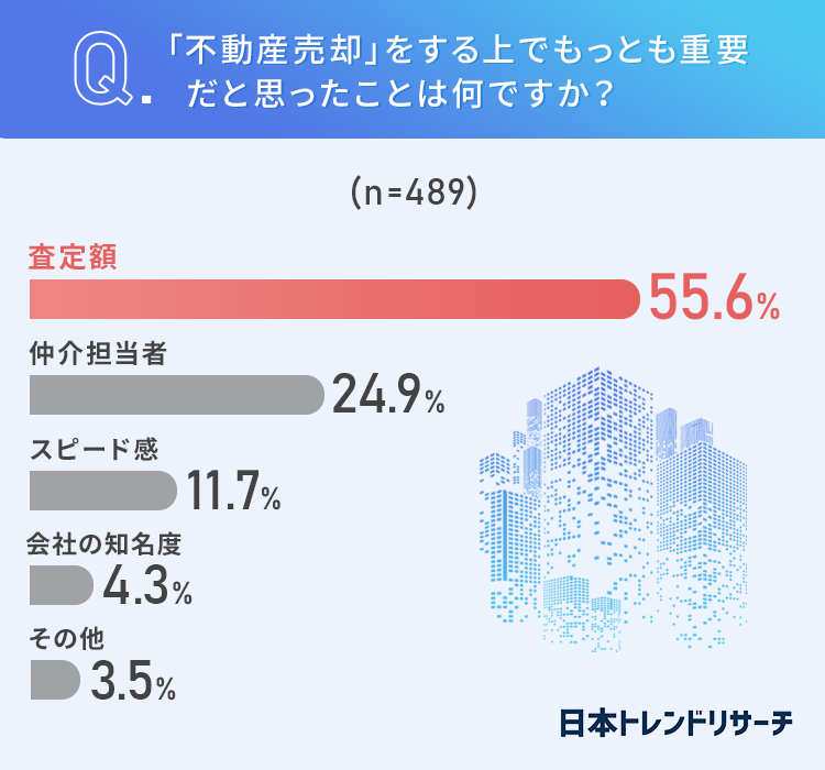 一方で、不動産売却経験者に実際に重要だと思ったことを聞いたところ、「査定額」と回答したのは55.6%という結果に。