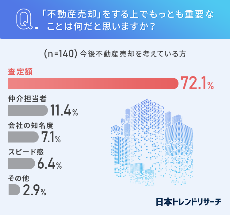 不動産売却をしたことはないが今後考えているという方が重視したいことは、「査定額」が72.1%で圧倒的に多い結果になりました。