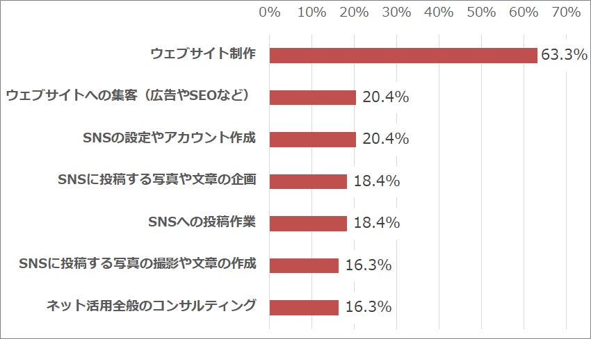 外注内容についてはウェブサイト制作が63.3%と最も多く、SNS投稿など自分自身で取り組めるものは取り組み、自分たち自身ではできないことを外注していることがわかった。