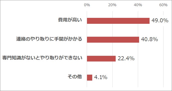 最後に、外注時の課題について質問したところ(Q16)、「費用が高い(49.0%)」、「外注との連絡ややりとりに手間がかかる(40.8%)」、「こちらに専門知識がないとやり取りができない(22.4%)」という順に、外注には高いハードルがあることがわかった。