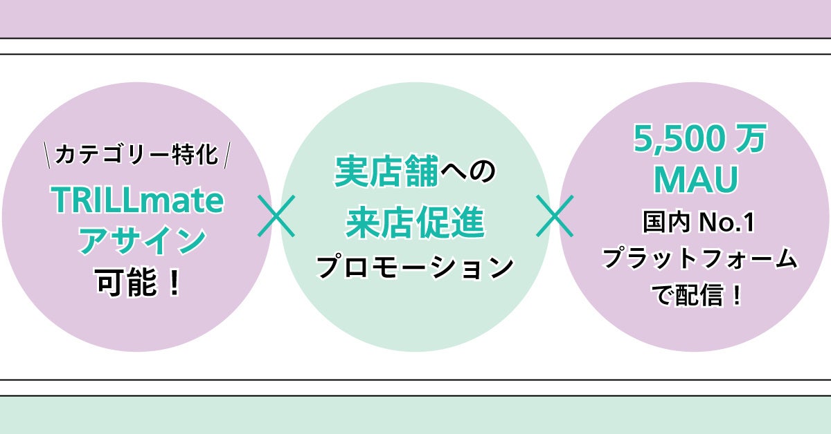 TRILL( https://trilltrill.jp/ )は月間利用者数5,500万人突破の国内No.1の女性向けライフスタイルプラットフォームです。国内最大規模のユーザー・トラフィック数を武器としたタイアップ広告・動画広告メニューの他、インフルエンサー/クリエイターキャスティングやSNS広告配信などワンストップでのソリューション提供が可能です。