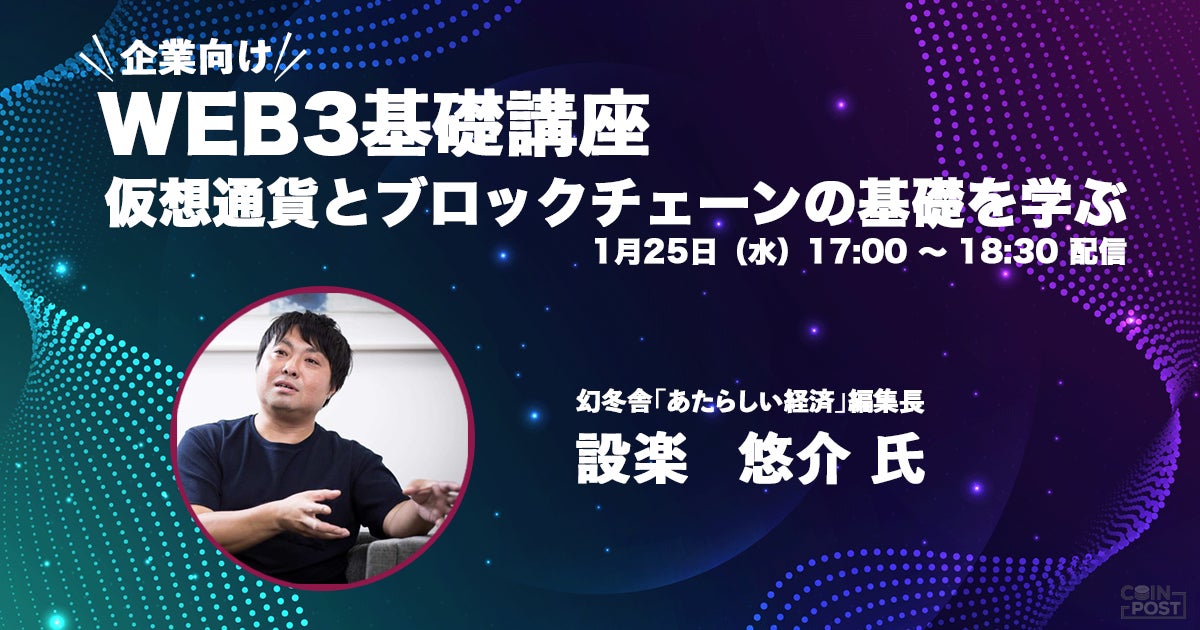 仮想通貨やブロックチェーンに関するニュースを専門に扱うオンラインメディア「CoinPost」を運営する株式会社CoinPost(本社:東京都荒川区、代表取締役CEO:各務 貴仁)は、国内事業者向けにWeb3に関する連続セミナーを毎月開催します。連続セミナーの初回を、「Web3基礎講座 仮想通貨とブロックチェーンの基礎を学ぶ」と題して1月25日(水)に開催いたします。