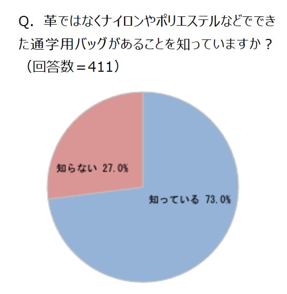 「革ではなく、ナイロンやポリエステルでできた通学用バッグがあることを知っていますか?」という質問には、「知っている」と回答した人が73.0%。また、「あなたはお子さんに(通学用バッグではなく)ランドセルを使ってほしいと思いますか?」と聞いたところ、「はい」と答えた人が72.3%でした。「ランドセルを使ってほしい」という意見としては「日本の文化の一つだと思うから」「小学生のシンボルだから」「6年間使うものなので、長持ちしてほしいから」という声が集まった一方で、「いいえ」と答えた人は、「通学バッグの方が軽く、体に負担がかからなそうだから」などの意見がありました。ランドセルは子どもの体への負担減に対する期待が高まり、通学バッグは丈夫さを懸念する声が多く今後の進化に注目が集まりそうです。