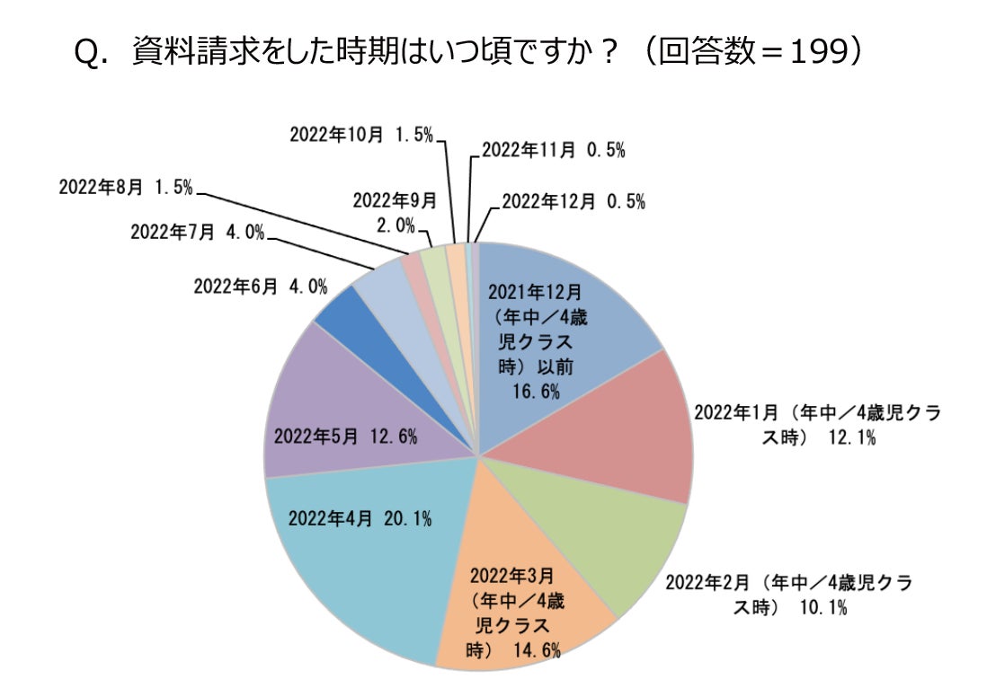 調査を実施した2022年12月時点にすでにランドセルを購入した349人のうち、資料請求をした人は57.0%。資料請求時期は2021年12月以前(年中/4歳児クラス時)〜2022年3月(年中/4歳児クラス)までに請求した人が53.4%に上りました。